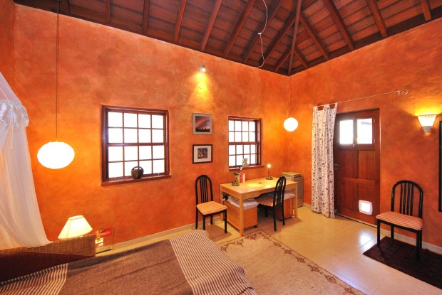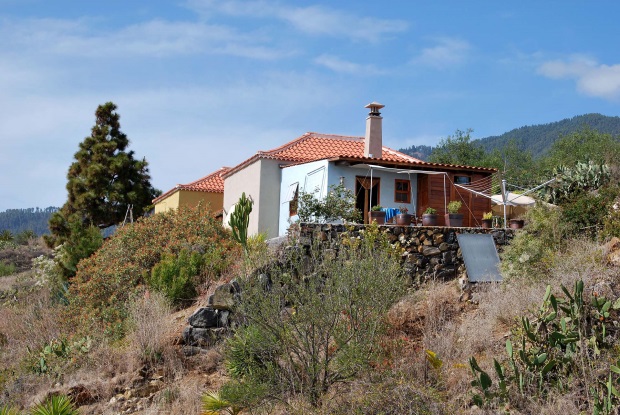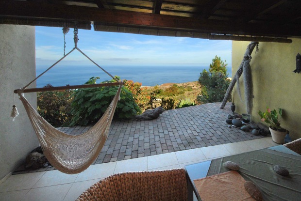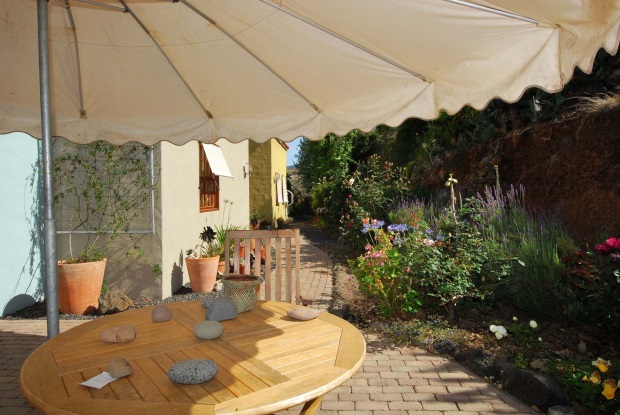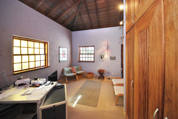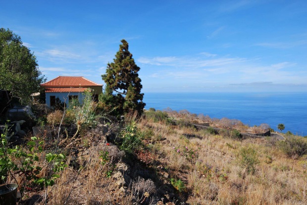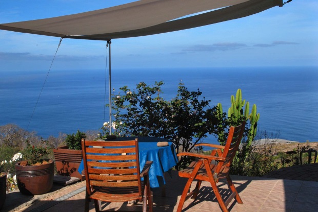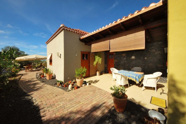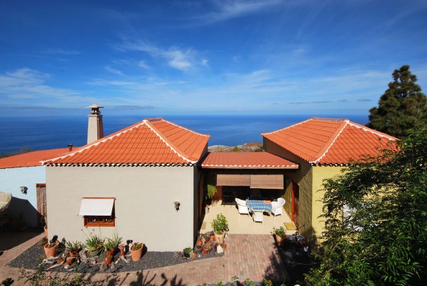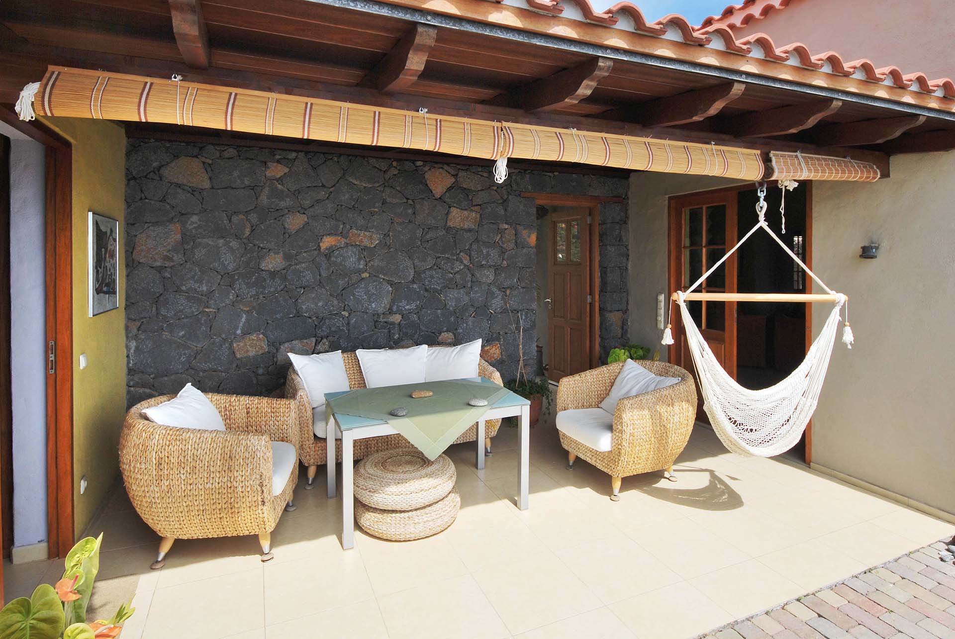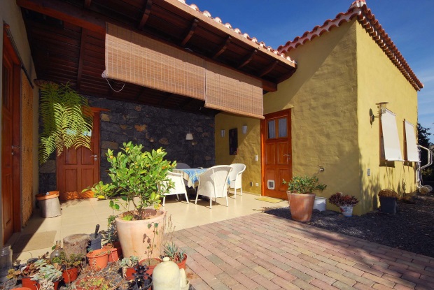 What is so appealing to the life on La Palma? The contiguousness to the nature, the balanced climate and the life in fresh and pleasantly tempered air are certainly some decisive reasons. Such motives are reflected in the architecture of this exceptionally tasteful and well thought out designed villa. The centers of this house are two roofed and by a classical stone wall separated terraces. They connect the living- with the sleeping quarters, so that all of the rooms have access by only one door to the wind and weather-protected outdoor area, to enjoy the wonderful view of the Atlantic Ocean and the lovely scenery of Tijarafe. One terrace faces the East, so you can have breakfast either at the first rays of the sun outside. The other