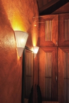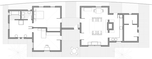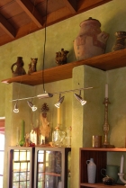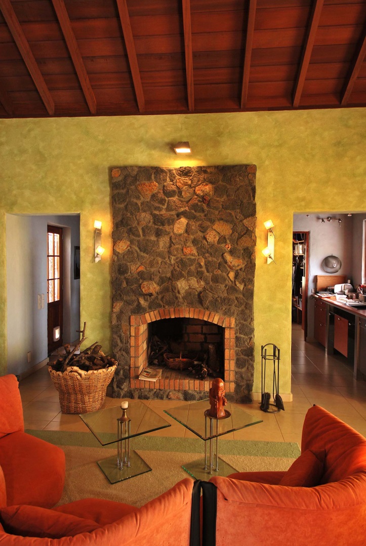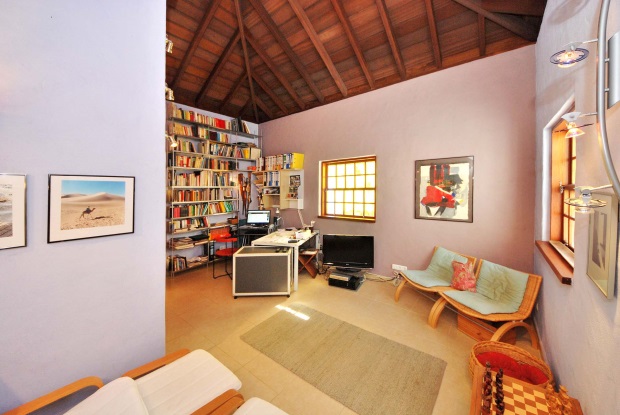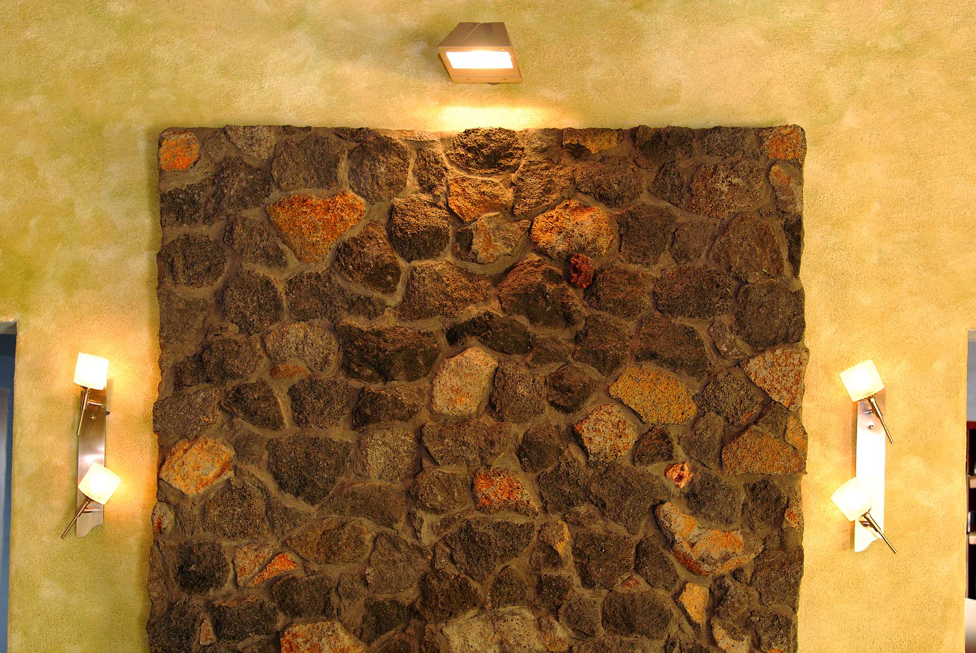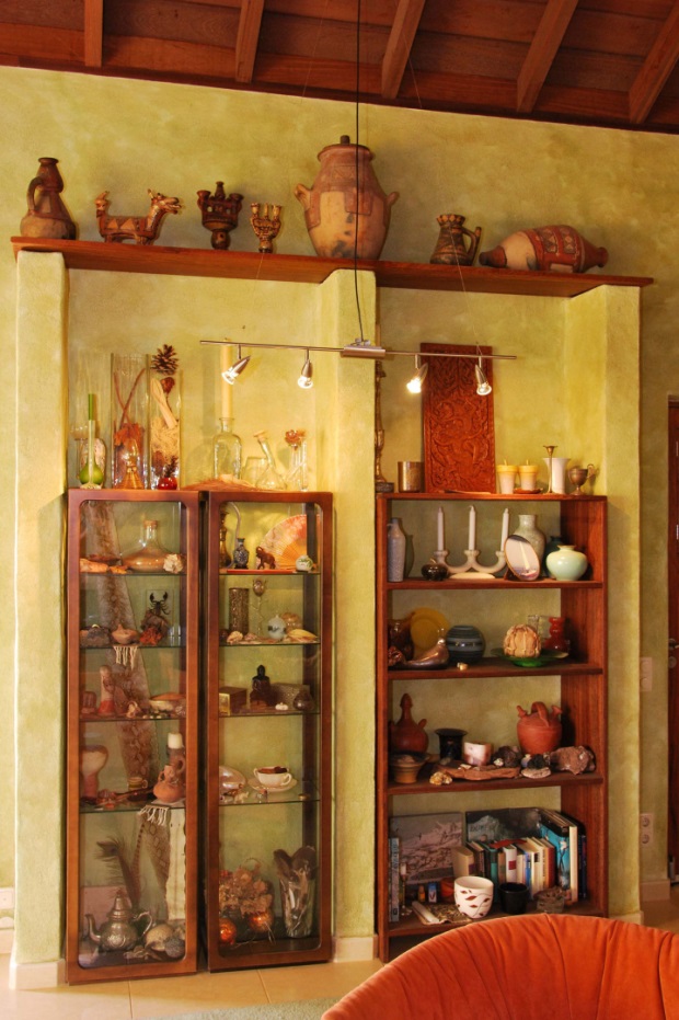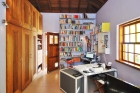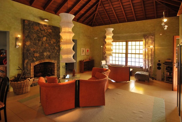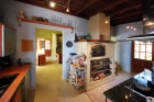 The very large and high built (3,40 m eaves height, ridge height of 6 m) living-room with a Canary roof framework joins the terraces to the south. The classic hip roof form provides a natural temperature in the rooms, because the warm air gathers under the pediment, while the temperature remains pleasant in the residential area. The living room is dominated optically by a fire-place covered with natural stones that finds its artistic counterpart in its with wood and protected glass door built-in cabinets on the opposite wall. On both sides of the fireplace are the passages to the semi-open kitchen. This arrangement allows also within the residential area the choice of a seat in the east or west window, so you can enjoy your meals in the house in the early or evening sun with sea view. At the same time you have very short distances to the kitchen.