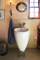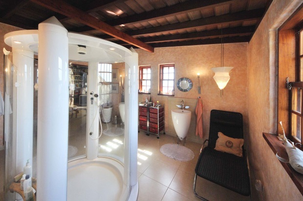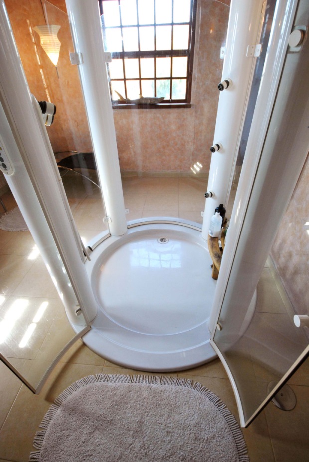 On the west side is the bathroom of the living area (or guest bathroom) with walk shower in discreet natural stone look.