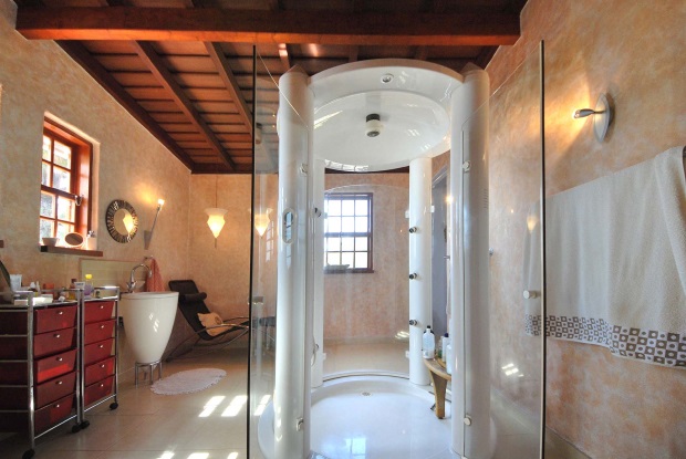 Another highlight of this property is the attached, light-filled master bath: It finds its optical center in the free-standing, circular temple shower with massage jets. Two designer sink, a bathtub located in a niche with sea view and a separate