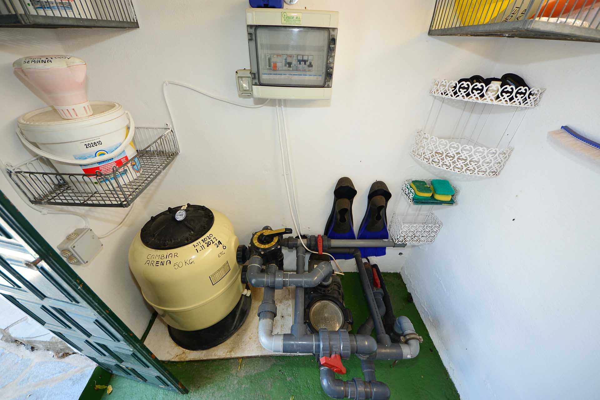 The house is equipped for colder days with a chimney stove in the living room, as well as with heat pump air conditioners with heating function. It is of course connected to the public electricity grid. The infrastructure for share water is available, there are water tanks for the garden irrigation with share water in partial ownership, the city water connection will be made.
