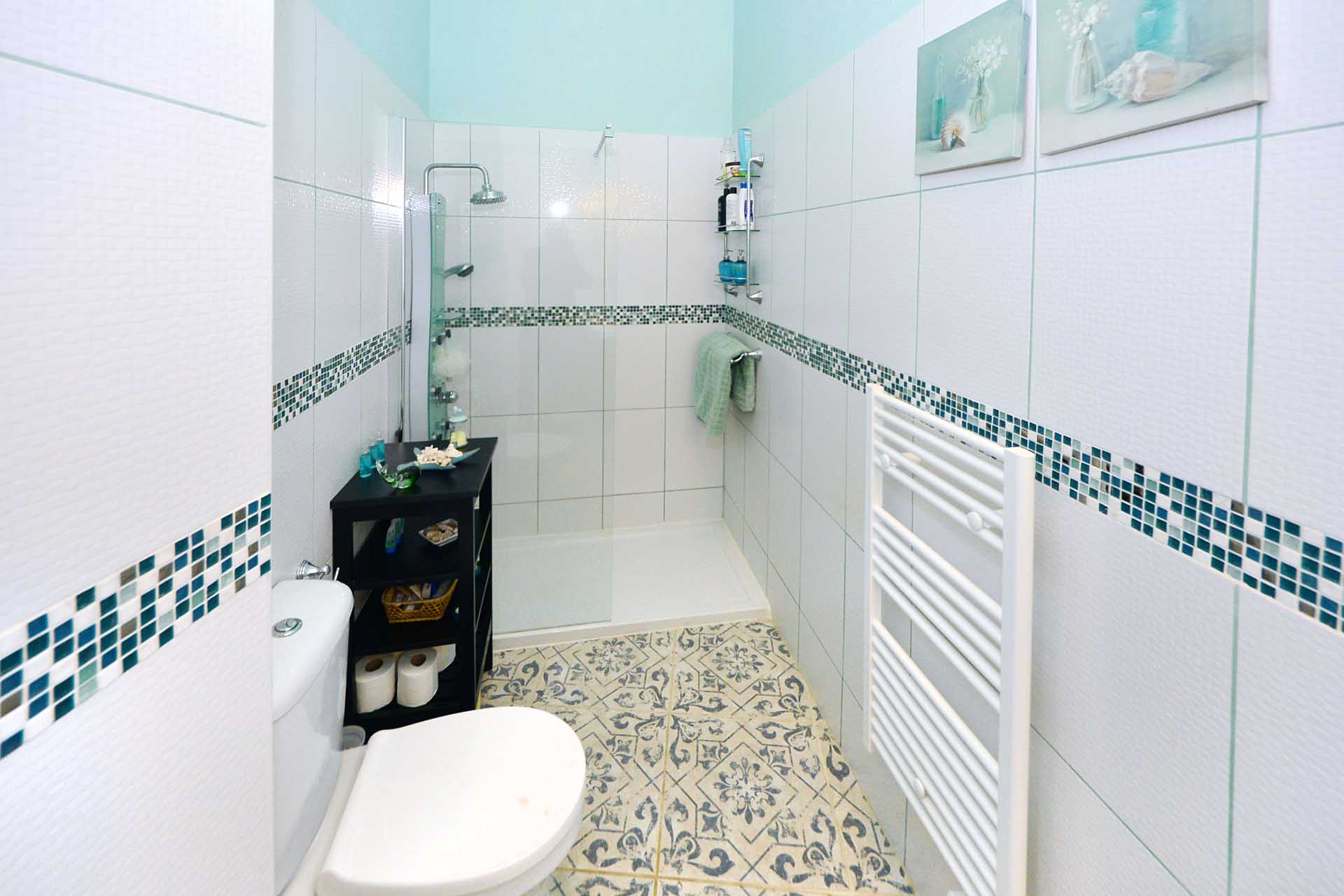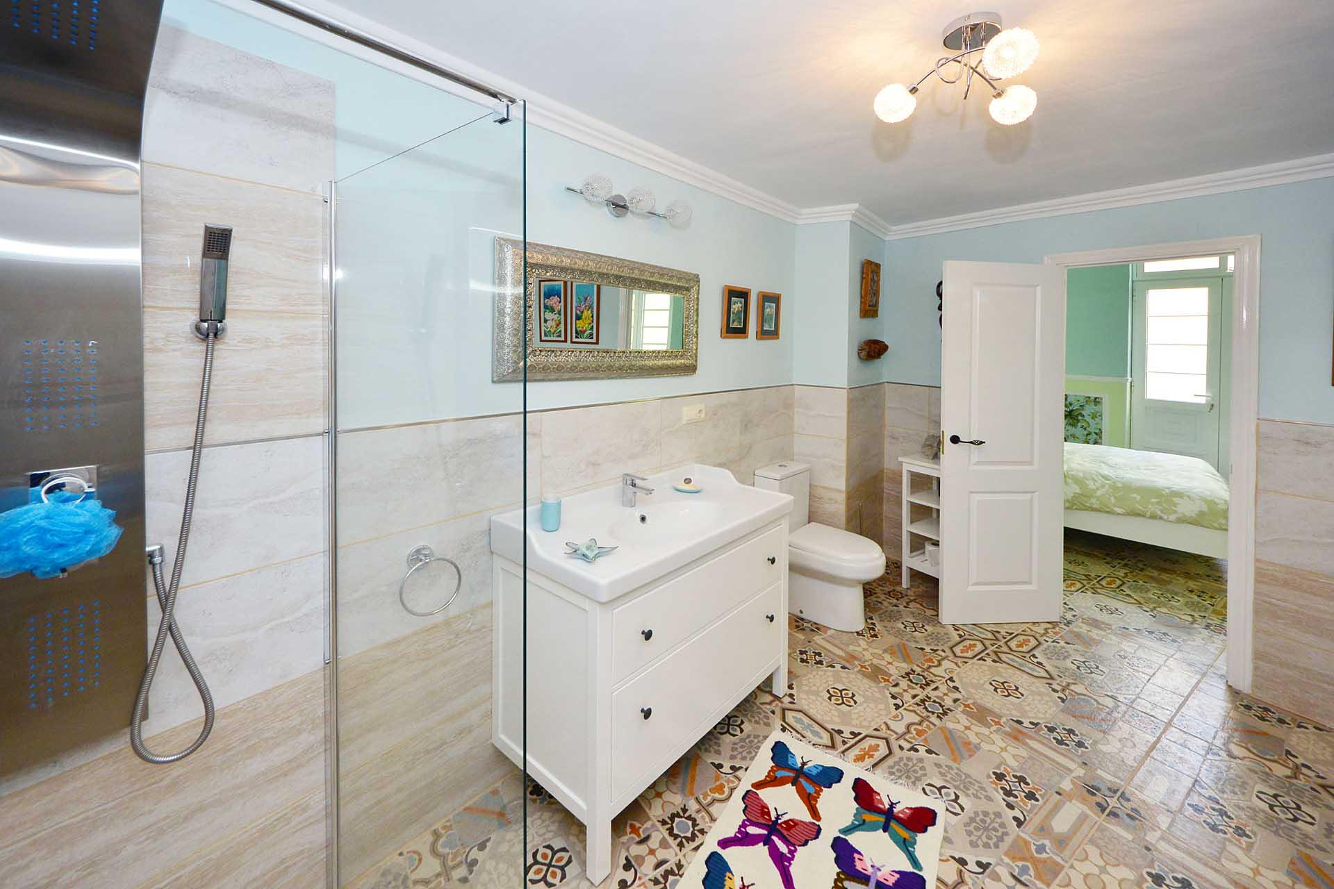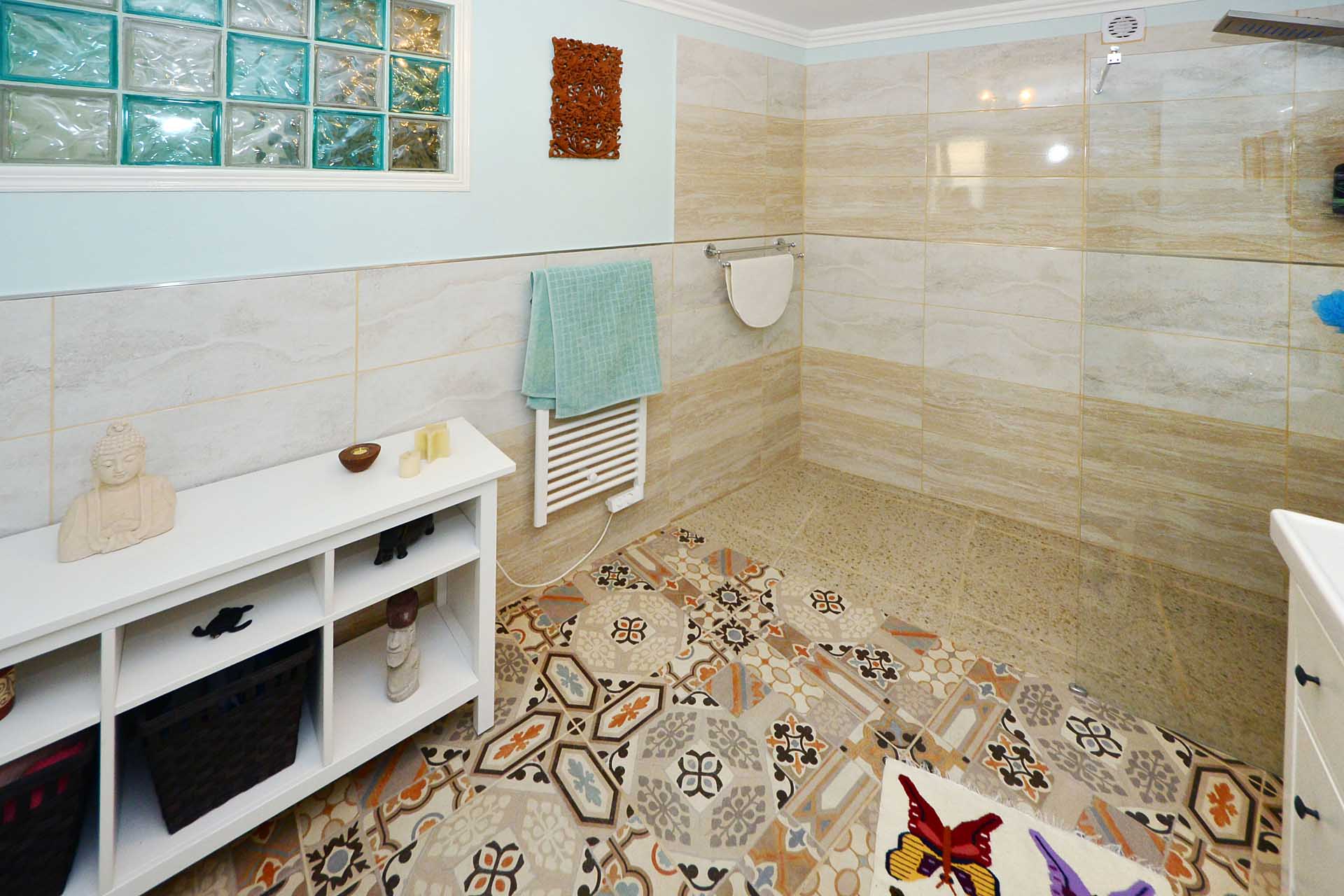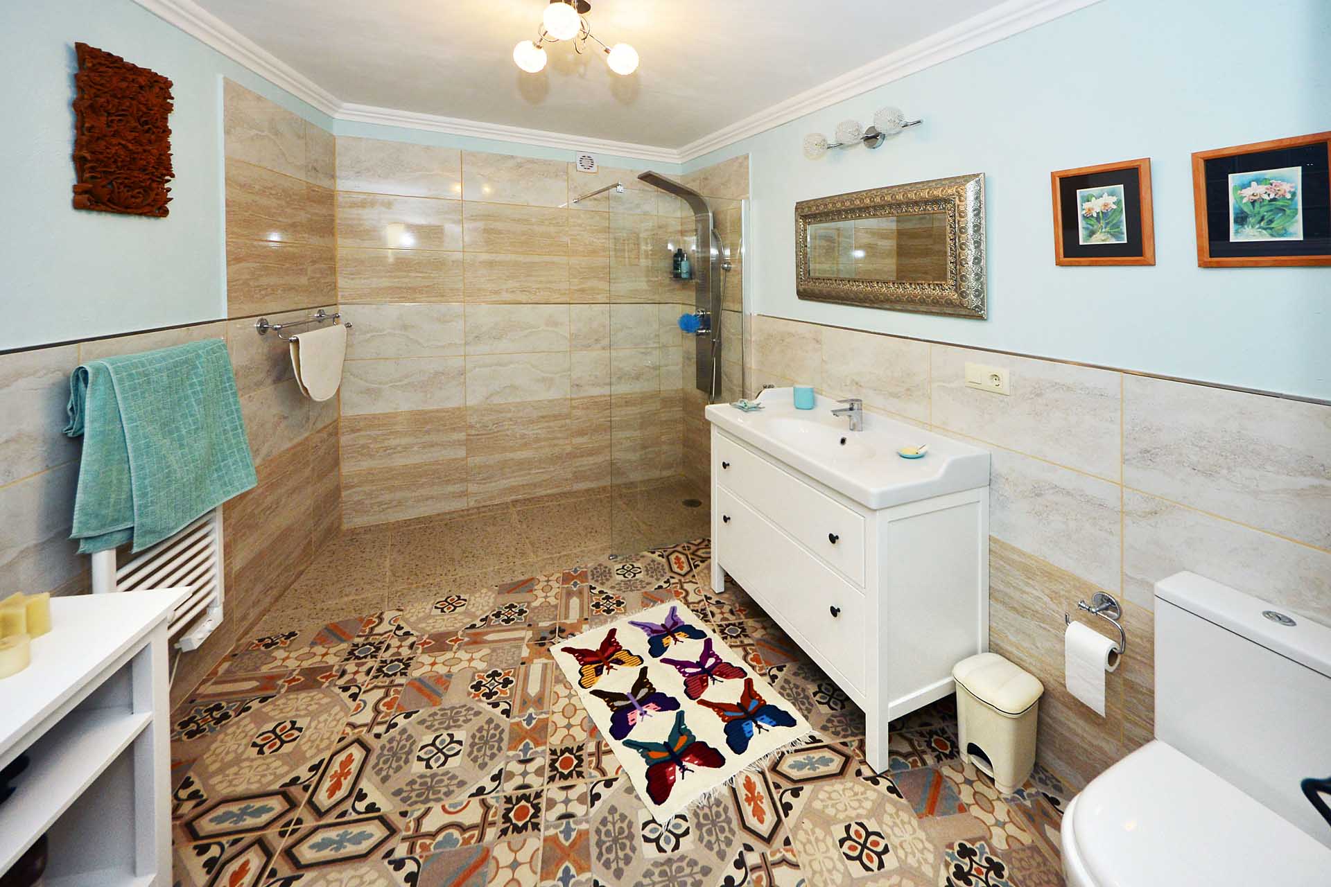 On the ground floor it is divided into a stylish living room with a wall fountain, a spacious bedroom with a modern bathroom on suite with a large, ground-level shower and two small storage rooms. The ground floor can be used very well as a separate guest area.